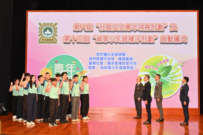 典禮上,首先進行第七屆「社區安全青年領袖計劃」及第12屆「滅罪小先鋒種子計劃」結業儀式,共有241位學員順利結業,司警局領導層和出席嘉賓向結業學員頒發結業證書,以及向127位表現優秀、積極參與防罪滅罪宣傳和社會義務工作的學員頒發獎狀。結業儀式結束後,隨即舉行第八屆「社區安全青年領袖計劃」及第13屆「滅罪小先鋒種子計劃」啟動儀式。今年分別有來自本澳七所高等院校的100名大學生,以及來自42所中學的300名中學生參加防罪培訓,在司警局領導層監誓和一眾來賓見證下,學員由代表帶領進行莊嚴宣誓,新一屆青少年防罪培訓計劃正式啟動。