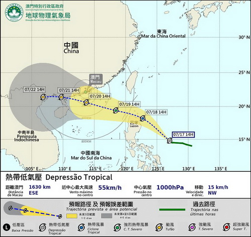 周三在菲律賓以東海面形成的熱帶低氣壓周五就會掠過菲律賓,目前多地氣象部門預測其會進入南海並影響珠江口一帶。氣象局周四下午發出特別提示指出,位於菲律賓以東的熱帶低氣壓正逐漸增強,按照現時預測路徑,周六初時將進入本澳800公里範圍,屆時發出一號風球。