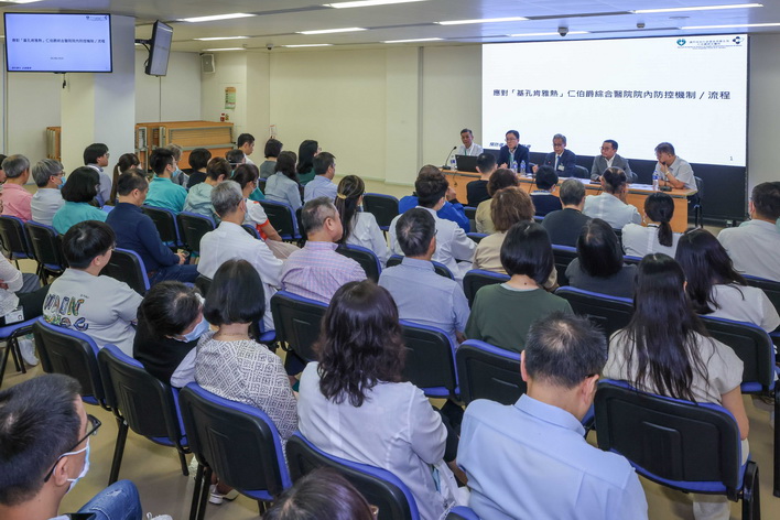 「應對基孔肯雅熱院內防控機制流程」宣導會重點向仁伯爵綜合醫院醫護人員講解了病例住院期間需採取的防蚊措施、院內防控機制流程、防護與環境管理等,以確保發現疑似或確診病例時,能迅速及規範地啟動院內防控機制,從而儘早控制傳染源、保障社區安全。