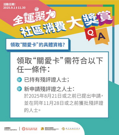 目前本澳正值風雨季節,天氣變化頻繁,且本次消費立減優惠使用期達三個月時間充裕。經科局與社工局呼籲長者及持殘評證人士無須急於前往服務地點辦理新版長者卡更換或關愛卡申領手續,確保出行安全。