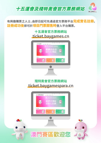 【本報消息】第15屆全國運動會及全國第12屆殘疾人運動會暨第九屆特殊奧林匹克運動會將於本年11月、12月在粵港澳三地舉行。澳門將會承辦15運會的乒乓球、三人籃球、五人籃球(男子18歲以下組)、排球(女子成年組)及空手道五個項目,以及殘特奧會兩個羽毛球項目。各賽區的項目賽事門票將根據競賽安排分階段、分批次銷售。有興趣購票之人士,必須通過官方票務平台完成實名註冊,註冊成功後再於項目門票開售時登入平台購票。