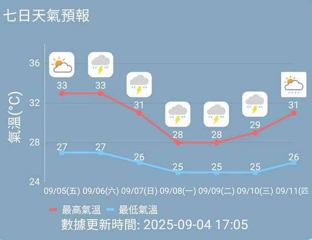 目前預測周六初時天氣仍然酷熱,雲量將逐漸增多,只部份時間有陽光,有幾陣驟雨且稍後有幾陣雷暴,吹二至四級東至東北風及有陣風。下周日將是屬於秋天的節氣「白露」,預測當日多雲但仍短暫時間有陽光,間中有驟雨並有幾陣雷暴,吹三至四級偏東風及有陣風。