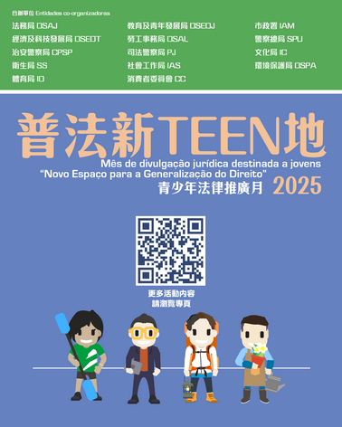 更多詳情可掃瞄海報中的二維碼,瀏覽2025「普法新TEEN地」青少年法律推廣月專題網頁,以及請留意各合辦部門公佈的活動資訊。