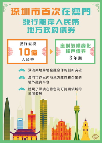 【本報消息】深圳市人民政府周二成功在澳門特區發行10億元人民幣地方政府債券,是深圳市首次在澳門發行離岸人民幣地方政府債券,也是首次在澳門發行以應對氣候變化為主題的綠色債券。澳門金融管理局對債券的成功發行致以祝賀,並感謝國家財政部、深圳市人民政府對澳門發展新金融業態的支持。