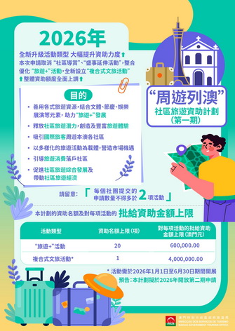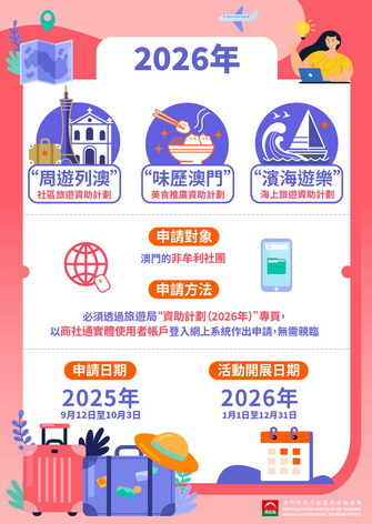 【本報消息】旅遊局「周遊列澳」社區旅遊資助計劃、「味歷澳門」美食推廣資助計劃和「濱海遊樂」海上旅遊資助計劃於9月12日至10月3日接受申請,申請須以商社通實體使用者帳戶登入旅遊局「資助計劃(2026年)」專頁提交。旅遊局將於9月11日舉行線上講解會,歡迎有興趣的社團參加了解詳情。