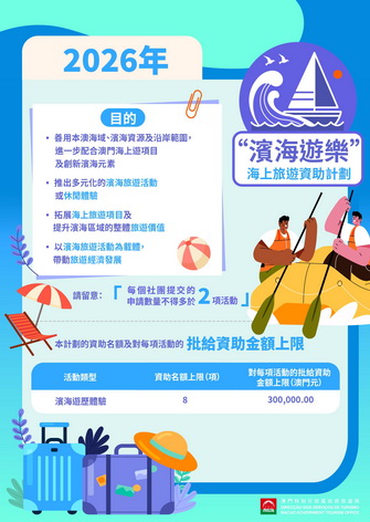 旅遊局透過三項資助計劃,積極鼓勵及支援澳門依法成立及註冊的澳門非牟利社團舉辦及開展旅遊活動,深化「旅遊+」跨界融合,拓展多元旅遊體驗;期望透過社區旅遊、美食文化及濱海遊憩三大領域,進一步釋放澳門旅遊潛力,吸引旅客玩樂消費,刺激社區經濟。