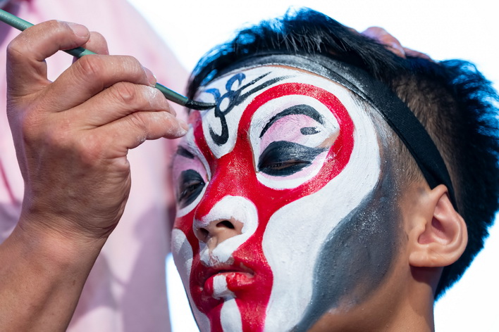 校園導賞主講人吉林藝術學院戲曲學院表演系副主任關焱向在場師生介紹京劇文化、行當妝面,吉林藝術學院師生除現場示範《四郎探母·坐宮》、《轅門射戟》、《大保國》、《扈家莊》等著名京劇選段外,更親授學生各種造手與亮相,邀請學生現場化妝勾臉譜,穿戴上行頭,扮演生(楊波)、丑(燈官)、旦(楊玉環)、武生(孫悟空);現場學生熱情反響,沉浸式體驗國粹藝術的魅力,認識中華民族的優秀傳統文化精髓。