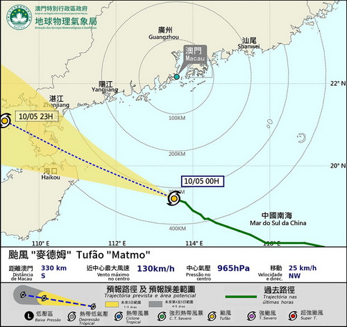 按照現時預測,「麥德姆」將在10月5日凌晨至早上最接近本澳,於本澳以南約300公里掠過,並有機會增強至強颱風級別。由於本澳位於其八級風力範圍的邊緣,加上受其外圍雲雨帶影響,預料本澳風力將會間中達至八級,並伴隨強烈陣風,因此氣象局將於凌晨二時改發八號東南風球。