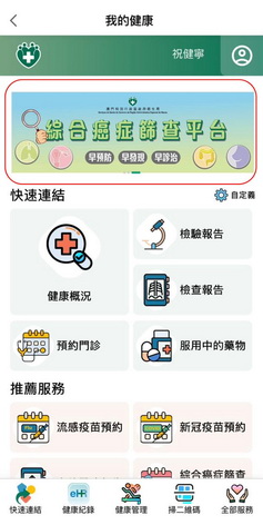 【本報消息】癌症是由多種原因引起的慢性病,與遺傳、環境以及生活習慣等因素有關。世界衛生組織指出,三分之一癌症可透過實踐健康生活模式和減少接觸致癌因子來預防。為貫徹落實《健康澳門藍圖》所訂定的總體目標和各項指標,衛生局積極推行癌症的篩查工作,以達致「早預防、早發現、早診治,提高患者治癒機率的目的,並由10月9日起在一戶通「我的健康」內推出「綜合癌症篩查平台」,系統會根據居民的性別、年齡和問卷評估結果等資料,建議居民預約相應的癌症篩查服務,居民可在平台實現一站式預約子宮頸癌、大腸癌、乳腺癌和肺癌等主要癌症篩查服務及獲取更多相關資訊。