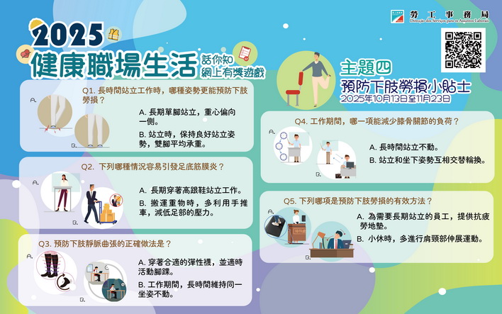 勞工局於今年六月上旬開始分別推出四期以職業健康為主題的「健康職場生活話你知」有獎遊戲,以提升巿民大眾認識及關注職業健康,第三期遊戲已於10月12日完滿結束。第四期職業健康有獎遊戲「預防下肢勞損小貼士」為最後一期遊戲,並於10月13日至11月23日期間舉行。凡於2025年12月31日年滿6周歲或以上,且持有有效澳門居民身份證的市民,可透過勞工局手機應用程式或掃描二維碼直接參與有獎遊戲。