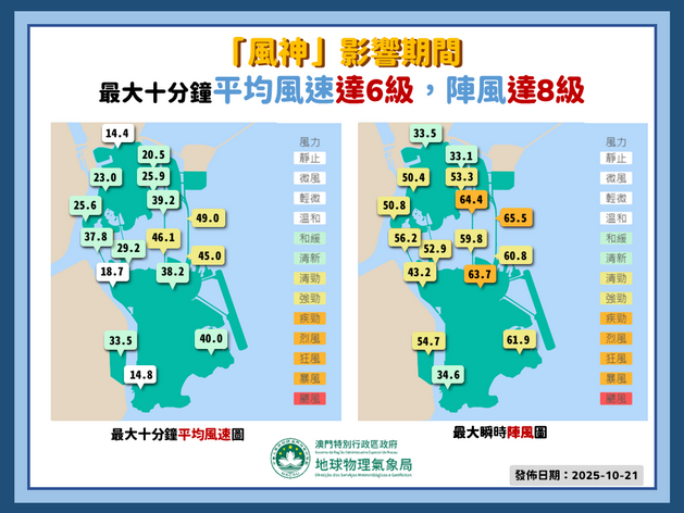 氣象局在「風神」遠離本澳後發出特別推送,指在一股較強的東北季風及「風神」的共同影響下,本澳由周一起開始轉吹較大的偏北風,由於盛行北至東北風,受地型阻隔下,平均風力不算大,但陣風風力多次錄得高達七至八級。