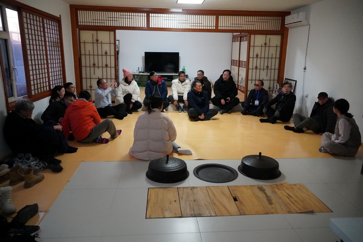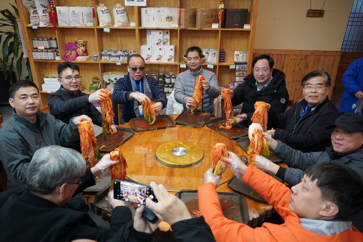 在光東稻香餐廳,參訪團成員圍坐一台,在在該村朝鮮族村民的指導下製作泡菜,將蘋果梨、薑、蒜、辣椒調製的特製醬料,均勻塗抹在已用鹽醃制好的大白菜葉片上,並現場品嘗。隨後,在打糕製作環節,參訪團成員掄起一米多長的實心塑膠錘,有節奏的捶打糯米,體驗傳統手工技藝的樂趣,現場歡聲笑語,氣氛融洽。
