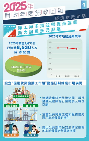 特區政府設立的「促進就業協調工作組」由經濟財政司司長擔任組長,統籌協調跨部門資源,動態研判人力資源趨勢,優化就業政策。針對畢業青年的求職需求,工作組協調跨部門收集各行業職位空缺,並透過大型招聘會進行配對,助力青年盡快投入職場。同時,協調收集綜合旅遊休閒、銀行金融及建築等行業的多元職位空缺,並透過針對性配對措施,有效促進居民就業。