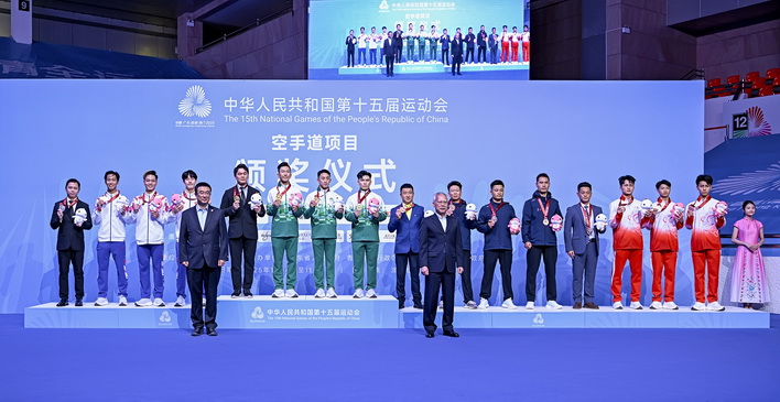 【本報消息】第十五屆全國運動會六日在澳門賽區進行空手道項目,坐擁主場優勢的澳門隊首日比賽即傳來喜訊,郭建恆繼2021年西安全運會勇奪個人型銅牌,為澳門奪得歷史性獎牌後,今屆夥拍隊友鄭沘珞及方文浩在男子組團體型再造出好成績,決賽以42.7分擊敗香港隊摘金,為澳門參加全運會以來首面金牌。澳門特別行政區行政長官岑浩輝出席頒獎禮,親自為澳門運動員頒發獎牌。