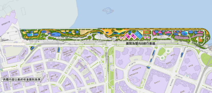 此外,還包括提升區內防洪及排澇能力。增建防洪堤、新建排水和截污系統(雨水箱涵+排水和截污泵站)。增設公共停車場。以及打造集康體、親子遊樂、濱海、綠化功能的大型休憩區。