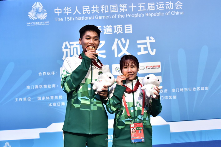 【本報消息】澳門空手道隊在「第15屆全國運動會」成績驕人,坐擁主場優勢的澳門隊繼首日比賽由郭建恆繼夥拍隊友鄭沘珞及方文浩在男子組團體型擊敗香港隊摘金,為澳門奪得全運會以來首面金牌後,於上周六最後一天比賽中憑著綜藝館的主場氣勢,方文慧及容君灝分別於女子-55公斤級和男子-67公斤級奪金,加上許家誠與李康喬各摘一銅,一口氣為本澳進賬共四面獎牌,至今於本屆全運會已取得三金兩銅,並將澳門參加全運會以來所獲的獎牌累積至三金三銅。
