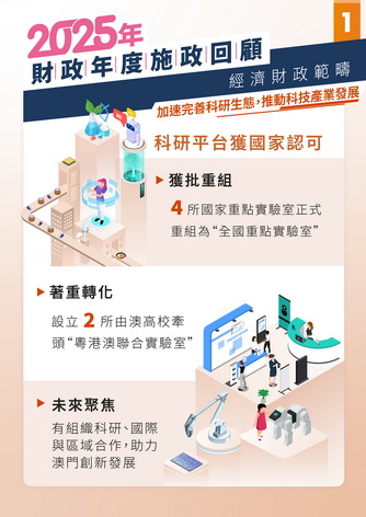 科技基金積極推動國家重點實驗室重組工作。澳門原有的四所國家重點實驗室於今年初獲國家科技部批覆重組為全國重點實驗室,將更加注重開展有組織科研以及拓展國際合作。同時,科技基金與廣東省科學技術廳共同支持建立兩所由澳門高校牽頭的粵港澳聯合實驗室,並於11月4日授牌。