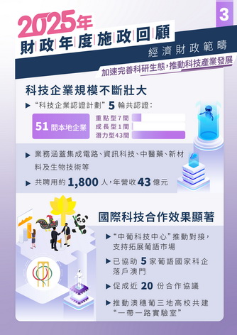 「科技企業認證計劃」至今已開展五輪,共有51間本地企業獲得科企認證,包括七間重點科技企業、一間成長型科技企業及43間潛力型科技企業,業務涵蓋集成電路、資訊科技、中醫藥、新材料及生物技術等領域。獲認證企業所聘用員工共約1,800人,年營收規模近43億澳門元。