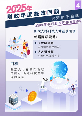 科技人才是科技創新及產業發展的重要基礎。為吸引澳門居民回流及引進外地優秀科技人才,科技基金增設了人才回流類及人才引進類資助,提供研發啟動經費,協助人才在澳門開展研發及創業。未來,特區政府將按序推進澳門科技研發產業園的建設,積極落實設立政府產業基金和科技成果轉化引導基金,以支持高新科技等新興產業發展,助力澳門加快推動經濟適度多元。