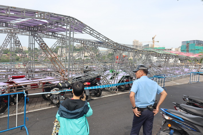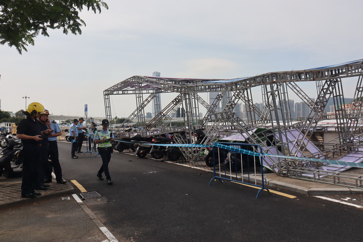 【本報消息】西灣湖廣場附近一個面積大約30米乘7米的大型金屬架周一早上突然倒塌,波及多架停泊在該處的私家車和電單車,幸無人受傷,警方和消防到場處理,初步相信金屬架被強風吹倒導致事故。