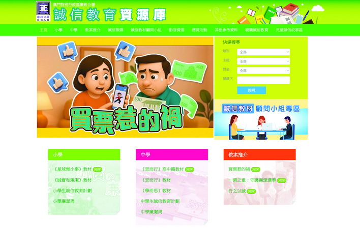 「誠信教育資源庫」(app.ccac.org.mo/educations/)除提供不同學科的誠信教案外,還備有誠信微課、兒童誠信故事、影音素材、刊物及德育活動等多元教學資源,為教育工作者的誠信教學或家長的親職品德教育提供多元化選擇和支援。