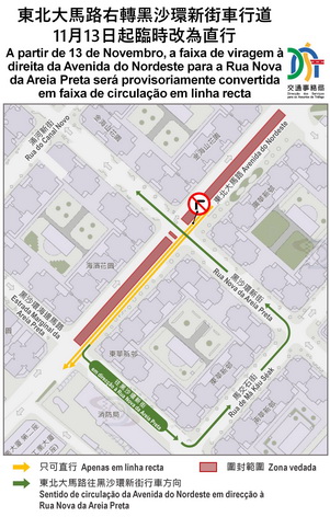 【本報消息】交通事務局與治安警察局持續留意東北大馬路空中走廊建造工程期間周邊各區域及道路的交通情況。因應工程期間東北大馬路每個方向只具備兩線行車條件,經兩局日常留意,東北大馬路與黑沙環新街交界經常出現交通瓶頸,為理順該交界路口之交通秩序,由11月13日上午七時起,臨時將東北大馬路右轉往黑沙環新街的專用車道,調整為只可直駛往慕拉士大馬路方向,以提升路口的交通流暢度。
