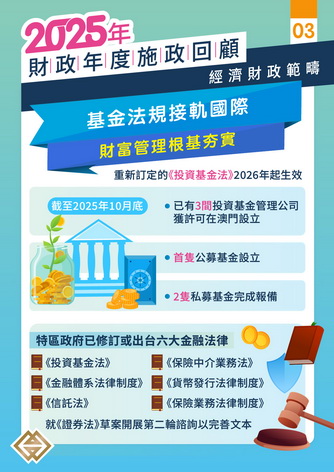 為促進財富管理市場發展,特區政府於今年七月頒佈重新訂定的《投資基金法》,並將於明年正式生效。該法律旨在加強與國際監管制度的接軌、提高對投資者的保護、增加投資工具的多樣性、移除基金管理運作和發展的障礙,以及優化基金投資及管理的環境。目前,已有三間投資基金管理公司獲許可在澳門設立,首隻公募基金已在澳門設立,另有兩隻私募基金完成報備。