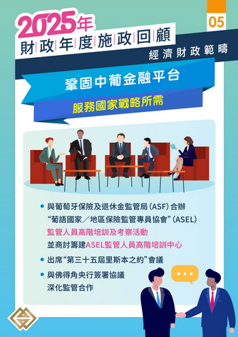 金管局於今年鴉月與葡萄牙保險及退休金監管局合辦「葡語國家/地區保險監管專員協會」監管人員高階培訓及考察活動;10月赴佛得角出席「第12屆葡語國家中央銀行行長會議」,並與佛得角央行簽署《關於監管事務的合作協定》,深化雙邊金融監管合作。此外,金管局亦出席在葡萄牙里斯本舉行的「第35屆里斯本之約」會議,並與ASF商討簽訂合作協議,籌建ASEL監管人員高階培訓中心,在澳門打造中葡金融人才培訓基地。