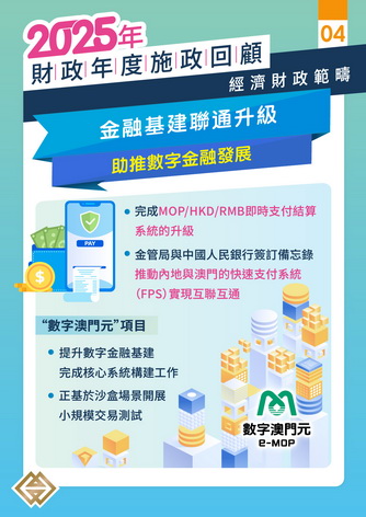 金管局今年內已完成港元和人民幣等涵蓋粵港澳大灣區三種法定貨幣的即時支付結算系統升級,採用最新的國際交易報文標準,並加強災備能力,延長服務時間,進一步提升交易資金匯劃和風險應對能力。同時,金管局與中國人民銀行簽訂備忘錄,共同推動內地與澳門快速支付系統的互聯互通。此外,正按部署推進「數字澳門元」項目,以提升數字金融基建,現已完成核心系統的構建工作,並正基於沙盒場景開展小規模交易測試。