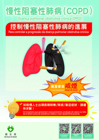 今年的11月19日是世界衛生組織及慢性阻塞性肺病全球倡議組織訂定的「世界慢性阻塞性肺病日」,主題為「呼吸不順暢,當心慢阻肺」(Short of Breath, Think COPD),旨在喚起各界關注和瞭解慢性阻塞性肺病。而衛生局防控煙酒辦公室及衛生督察於近日透過不同方式加強向吸煙人士推廣衛生局戒煙門診服務及《控煙法》等,鼓勵吸煙人士為了自己和家人的健康著想應立即戒煙,共同構建無煙健康生活環境。