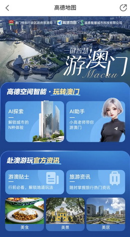 「一鍵智慧遊澳門」由11月26日在高德地圖手機應用程式正式上線,整合旅遊局官方資訊、節慶活動、景點實況、交通導航及遊玩路線等內容,為使用者提供個性化推薦,引領旅客深入探索澳門獨特多元的「旅遊+」元素,利用AI提升旅遊體驗,同時設有分享功能,鼓勵使用者交流實用建議及旅遊攻略。