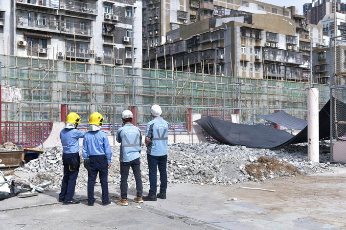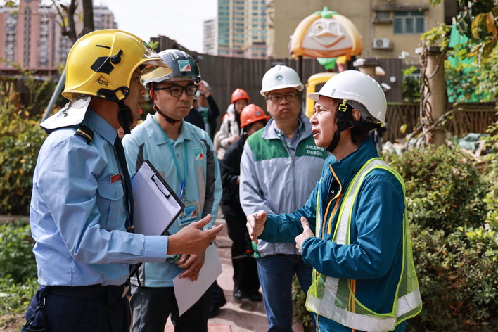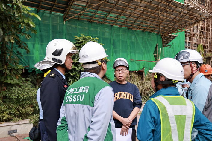 由消防局聯同土地工務局、勞工事務局及市政署組成的巡查隊伍,於11月27日早上兵分多路到高士德、提督馬路、祐漢街市等區,對正在實施外牆或天面翻新工程的住宅及工業大廈開展專項檢查。期間,工作人員向承建商核查棚架工程相關備案資料,核驗是否達標合規,並著重強調承建商需嚴格落實防火主體責任,規範工地設施管理,並重點檢查消防設施配備、危險品存放管理及緊急疏散通道等情況,從源頭排查消除安全隱患。聯合巡查期間所有項目均符合有關的安全要求,承建商亦已按規定出示棚架安全保護網的阻燃合格證明文件。