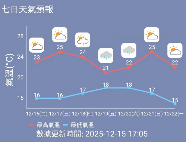 本周六是12月20日澳門回歸紀念日,氣象局原先預測本澳當日初時有幾陣雨,隨後天色會略為好轉並有短暫陽光出現,惟周一當局更新七日天氣預報後,預測當日未必有陽光,全日大致多雲並維持初時有幾陣雨,氣溫約為18度至22度。至於下周日冬至天氣始有所好轉,多雲及部份時間有陽光,最高氣溫回升至約25度。