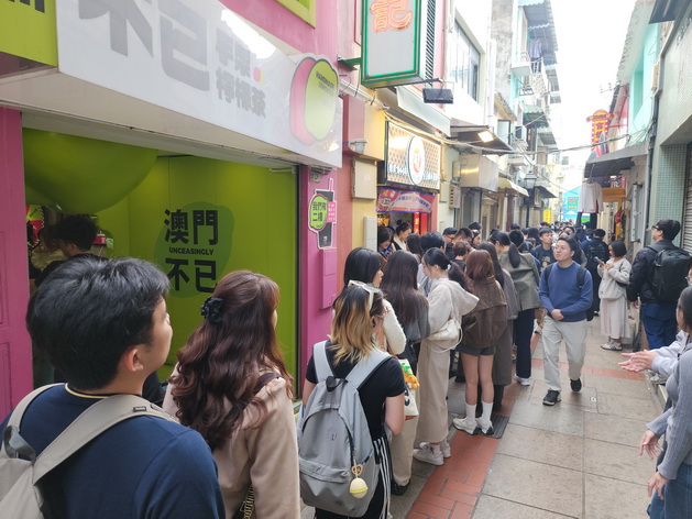 周日是香港聖誕連周末假期最後一天,本澳多個旅遊區人流依然人頭湧湧,當中氹仔舊城區不少備受旅客熱捧的店舖門外排起長長人龍,尤其官也街人流如鯽,至於近日開業的氹仔街市「美食+文創區」人流則稍為遜色,但仍不時見有旅客拖著行李箱到場覓食;而市政署在龍環葡韻一帶舉辦的冬季花卉展「紫色花田」不但吸引途經的旅客,也有不少本地居民利用周末假期到場與三萬盆各式各樣的紫色花卉拍照打卡。