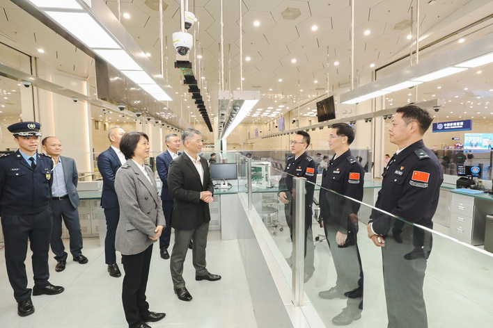 局長及後又前往橫琴口岸澳門口岸區視察通關安排,聽取節日期間客流分流措施簡報,並與珠海出入境邊防檢查總站副總站長、橫琴邊檢站站長石柱、橫琴邊檢站政委鄭戈交流工作部署。