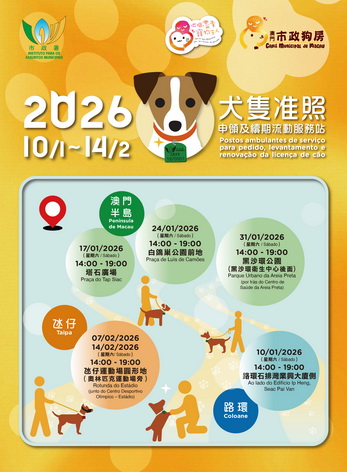【本報消息】為便利飼主辦理犬隻准照申領及續期,市政署將於1月10日至2月14日期間,在本澳各區設置「犬隻准照申領及續期流動服務站」,同場提供狂犬病疫苗注射及寵物領養查詢服務,宣揚預防狂犬病及領養代替購買。