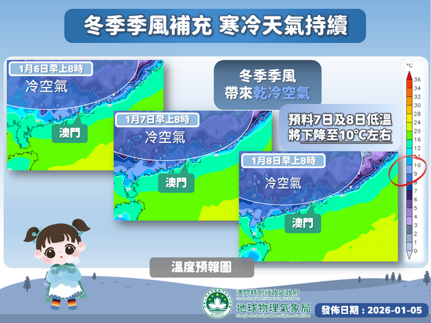 不過寒冷天氣未有完結,隨著新一股冬季季風補充於周一晚間抵達,本澳周二就會開啟持續「乾凍」模式,氣象局已發出黃色低溫提示,預料本澳未來數日天氣持續寒冷,且最低氣溫會低見9度至10度左右,較早前預測的再低一度,或有可能再度打破入冬最低溫記錄。