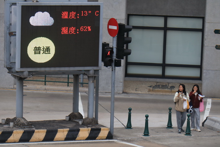 氣象局預測周五本澳仍會受到這股冬季季風影響,早上天氣仍然寒冷,多雲,短暫時間有陽光,吹二至四級東北風,氣溫約為10度至17度,相對濕度介乎百分之50至80之間,預測最高紫外線指數約為六,級別屬於高。
