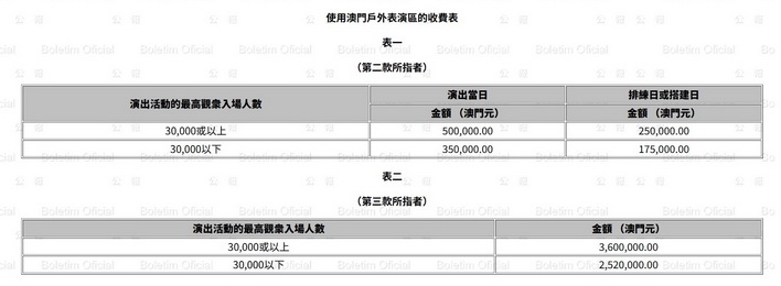 批示指出,自批示公佈翌日起至2026年12月31日的澳門戶外表演區試營運期間,若演出活動最高觀眾入場人數在三萬人以下,演出當日收費為35萬澳門元,排練日或搭建日收費為17.5萬;最高觀眾入場人數在三萬人或以上,演出當日收費為50萬,排練日或搭建日收費為25萬。演出活動實際完成及使用期完結後,可向文化局申請退回百分之二十五的收費金額。