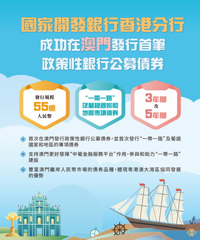 國家開發銀行香港分行首次在澳門發行政策性銀行公募債券,並首次發行「一帶一路」及葡語國家和地區的專項債券,是支持澳門更好發揮「中葡金融服務平台」作用,參與和助力「一帶一路」建設的重要體現。
