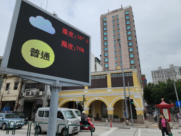 【本報消息】受偏東氣流影響,本澳周四起雲量增多,市區風力亦有所增大,氣象局預測周五天氣多雲,間中有雨,氣溫約為攝氏16度至19度,溫度體感會較為清涼;但風力增大後,過去多日的空氣不良情況將有所改善。展望下周初冷空氣將再次臨澳,珠江口沿岸最低氣溫將降至12度至13度,天色則會變得較為明朗,日照增多。