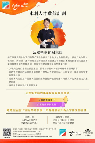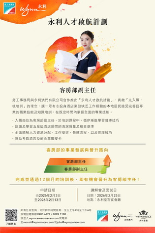 澳門居民如欲了解計劃詳情,可登入勞工局網站內相關專頁,有意參加者可由2月3日起至13日期間網上遞交申請。申請期結束後,永利將陸續通知符合條件的申請人,參加2月25日舉行的講座,隨即安排面試,詳細說明計劃的各項培訓內容及職業生涯發展路徑。
