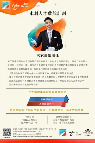 【本報消息】為培育本地人才,進一步提升澳門綜合旅遊休閒產業的國際競爭力,勞工事務局與永利合作推出「永利人才啟航計劃」,以先入職、後培訓方式,為本澳居民提供專業培訓及工作實踐機會,計劃由即日起正式接受申請。