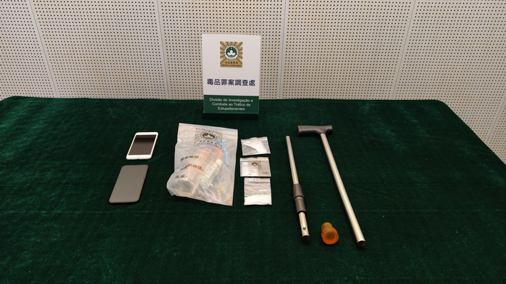司警早前收到情報指有一名傷殘人士涉嫌跨境運毒,經分析鎖定涉嫌人身份並作出部署。本月三日下午二時腳部傷殘的何某手持拐杖由內地經港珠澳大橋口岸入境,司警探員上前將其截查。及後司警在其拐杖中空位置起出兩包共重17.43克、市值約5.2萬元的冰毒,隨後又在其位於北區的住所起出吸毒工具。經取證,何某對毒品呈陽性反應。