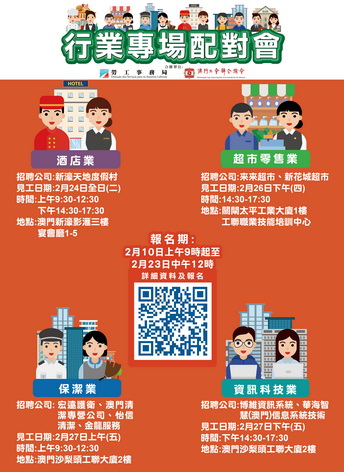 2月24日全日酒店業專場配對會在澳門新濠影滙三樓宴會廳1-5舉行;2月26日下午超市零售業專場配對會在關閘馬路101-105A號太平工業大廈第一期一樓工聯職業技能培訓中心舉行;2月27日上午保潔業專場配對會及同日下午資訊科技業專場配對會在沙梨頭海邊街2-6號工聯大廈二樓舉行。