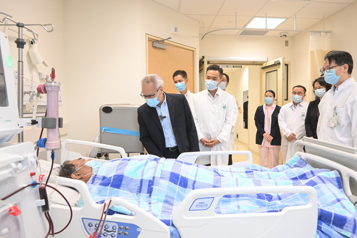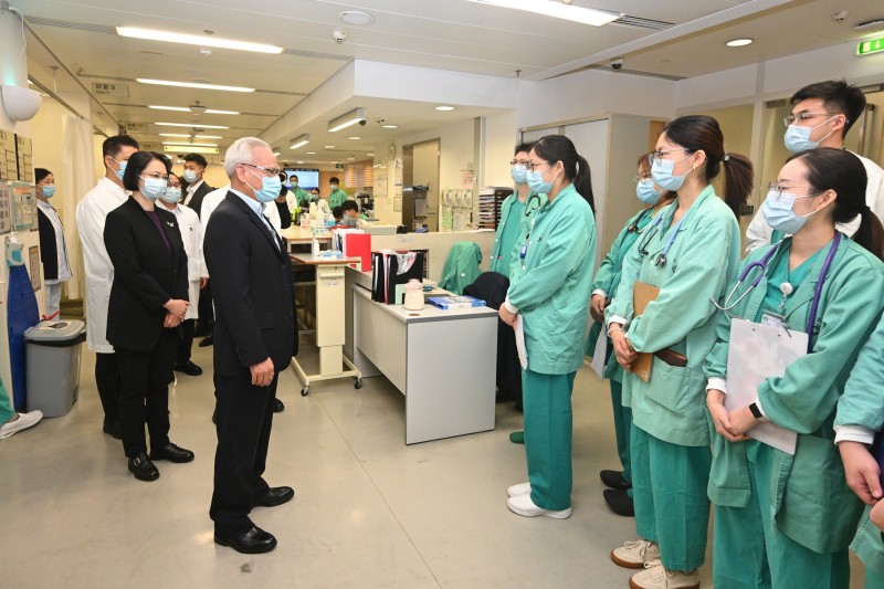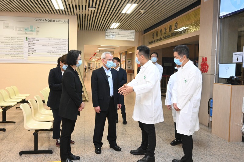 岑浩輝在社會文化司司長柯嵐及衛生局局長羅奕龍等陪同下,首先到仁伯爵綜合醫院視察。一行先到急診部及救護車區,瞭解新春假期急診服務運作情況,並關懷前線醫護人員的工作狀況。隨後抵達專科大樓病房,聽取專科服務運作介紹,期間慰問求診人士,並與醫院當值醫護人員親切交談,為他們加油打氣。岑浩輝祝願醫護人員身體健康,感謝他們不論何時,始終履職盡責、堅守崗位,盡心盡力為廣大居民提供醫療服務。