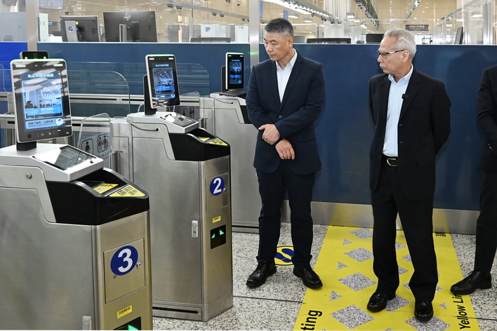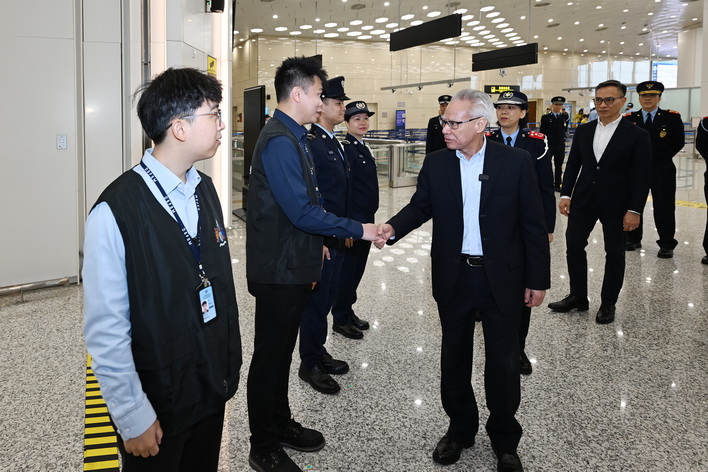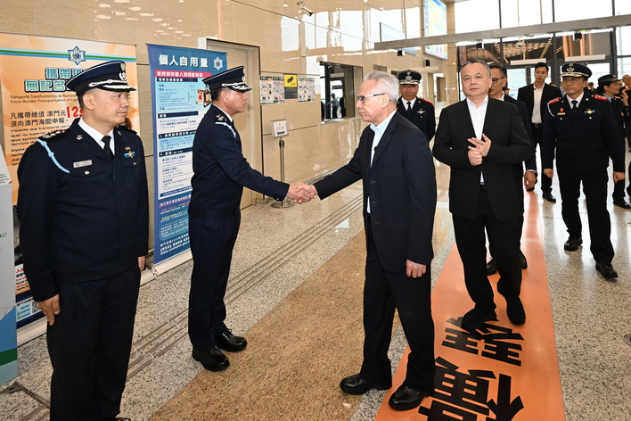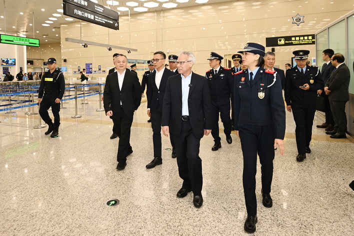 最後,岑浩輝抵達橫琴口岸視察離境大廳及汽車通道,先後聽取治安警察局代局長伍素萍、保安部隊事務局局長劉運嫦、海關助理關長葉華釗的口岸工作匯報,瞭解節假日期間的口岸通關情況、人潮管制方案、“刷臉”智能通關運作及擴建通道規劃、車道貨檢和旅客通關查驗等各項工作安排。