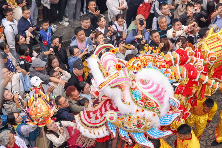 隨後,大金龍巡演隊伍沿東方斜巷、崗頂、龍嵩街、擺華巷、政府總部、卑第巷、聖老楞佐教堂、亞婆井前地、媽閣街,最後抵達媽閣廟。大金龍沿途與居民和旅客互動,祝願大家新的一年龍馬精神、福氣滿滿。