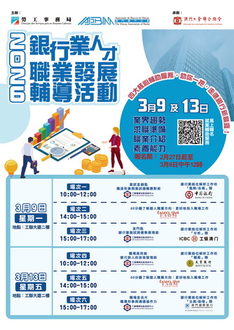 為協助求職者掌握行業資訊,提前加強基礎求職能力及做好職涯規劃,勞工局將於3月9日及13日先行舉辦六場「2026銀行業人才職業發展輔導活動」,包括四場「崗位解析工作坊」及兩場「職涯規劃工作坊」,主要對象為有志投身銀行業或欲轉職金融領域的本澳居民。