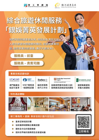 另外,勞工局和銀娛合作推出銀娛菁英發展計劃(酒店營運),以先入職、後培訓模式為本澳居民提供就業及培訓機會。計劃共提供20個職位空缺,包括10個服務員(前台)及10個服務員(貴賓司膳)。獲計劃錄取者將獲安排接受為期30個月的專業培訓及工作實踐。培訓內容涵蓋職前綜合培訓及職位技術培訓、劍橋領思實用英語會話培訓、初級及中級管理技巧課程、福布斯服務技巧工作坊等,並安排僱員考取國家職業資格茶藝大師、澳門職業技能認可基準(MORS)及WSET葡萄酒一級和二級課程認證等專業資格。